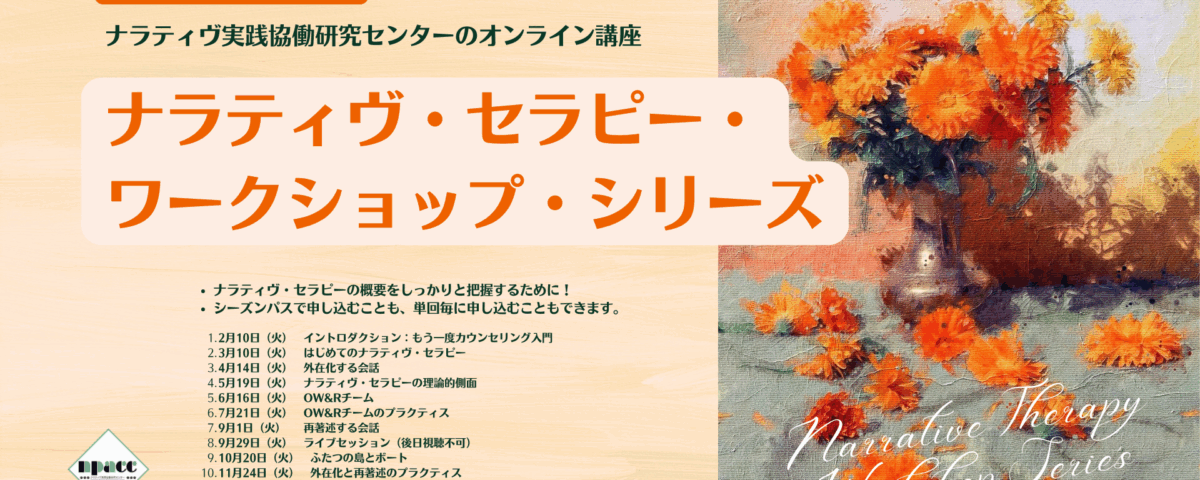 2021年に最初のナラティヴ・セラピー・ワークショップ・シリーズを実施しましたが、2025年にリニューアルしました。2021年に実施したワークショップ・シリーズの内容は、こちらのページをご覧ください。なお、2021年に実施したワークショップ・シリーズの録画は、えぬぱっく・ライブラリ(サブスク型サービス)で視聴することができます。