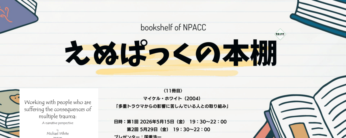 取り扱う書籍や文献は、NPACCの興味関心上、ナラティヴ・セラピーに関係するものや、近い領域のものになると思いますが、それに限らず大切さや興味深さを感じたものがあれば積極的に取り組んでいきたいと思います。